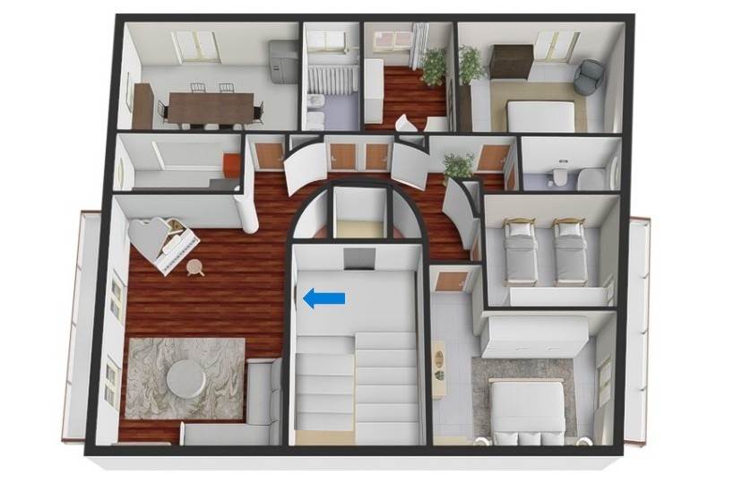 L'ampio corridoio fornito di armadiature ci porta nella zona notte suddivisa in camera studio, due camerette, comoda camera matrimoniale e i due bagni.
